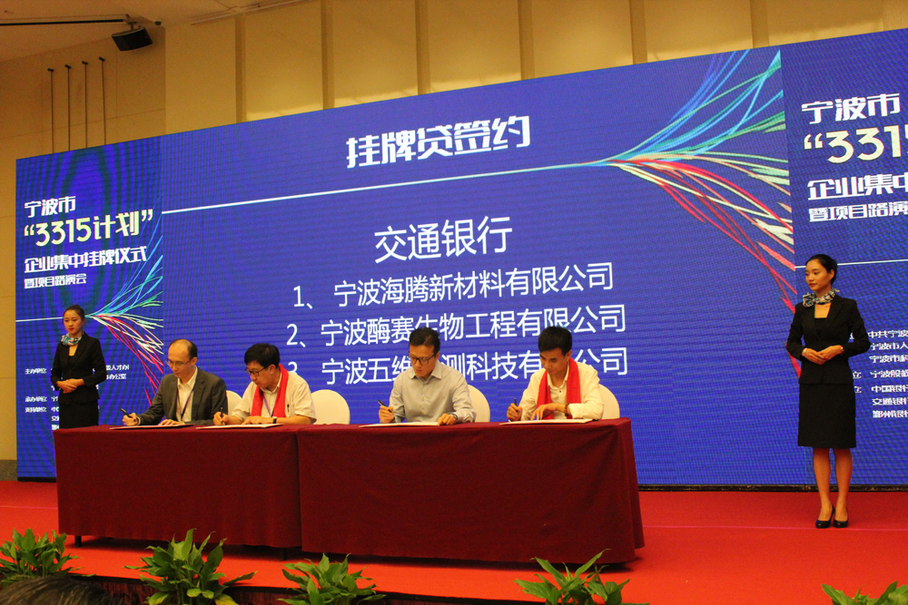 当天共22家“3315”企业正式在甬股交所挂牌,我司董事长黄勇开博士和总经理吕震林先生参加了此次活动,黄董事长参加了敲响锣鼓的仪式。下午还举行了“3315计划”企业授信签约仪式,宁波酶赛生物工程有限公司与交通银行签订了授信协议。